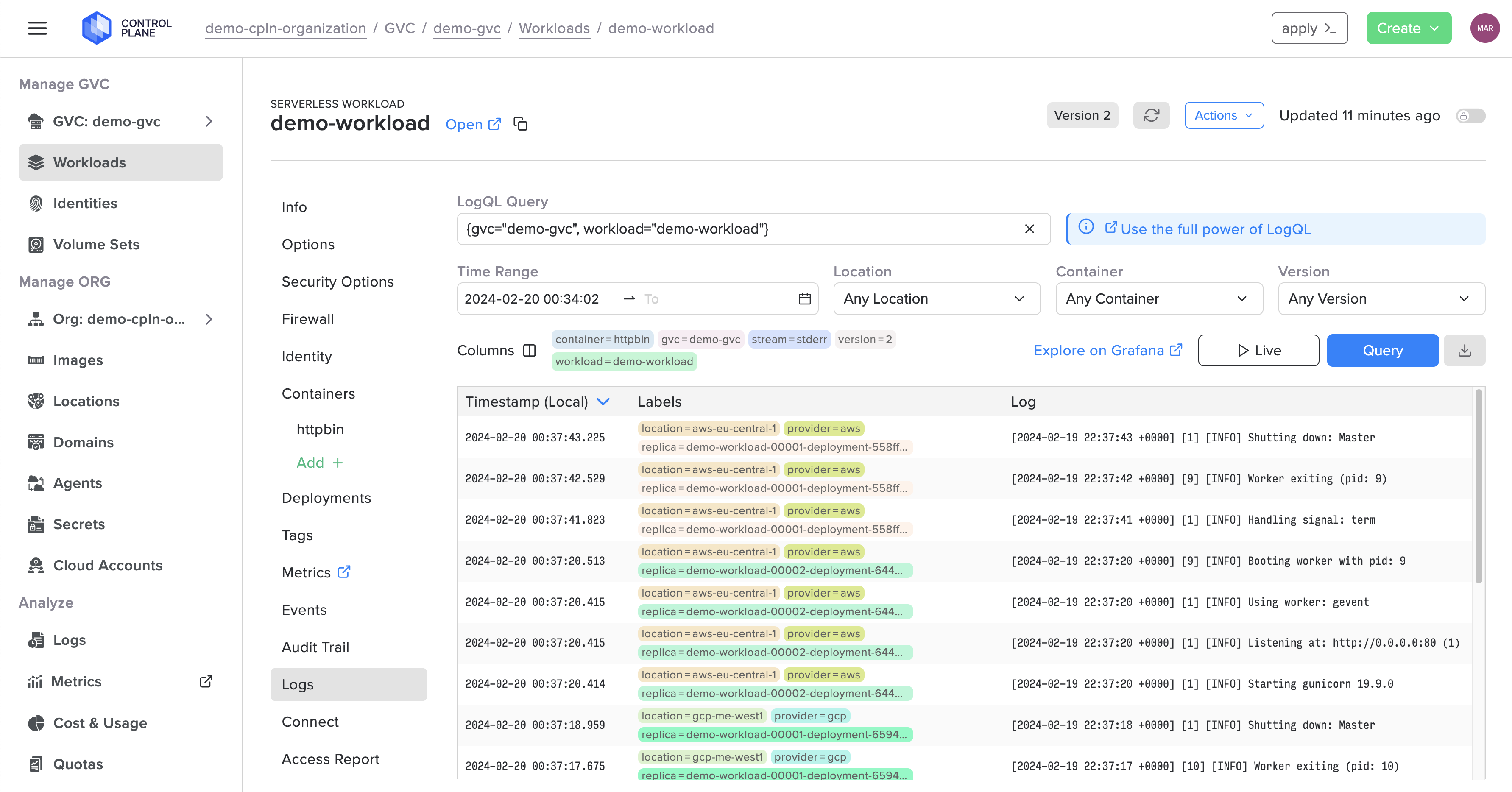 The logs UI displays the logs for your running workloads. No matter which combination of cloud providers or regions your workload is running at, the logs will be aggregated and displayed as if they were running at one provider/region. Filters can be applied to pinpoint any issues that might be occurring at a specific workload. The Grafana explorer is available to query and visualize your log data.Sample Log UI